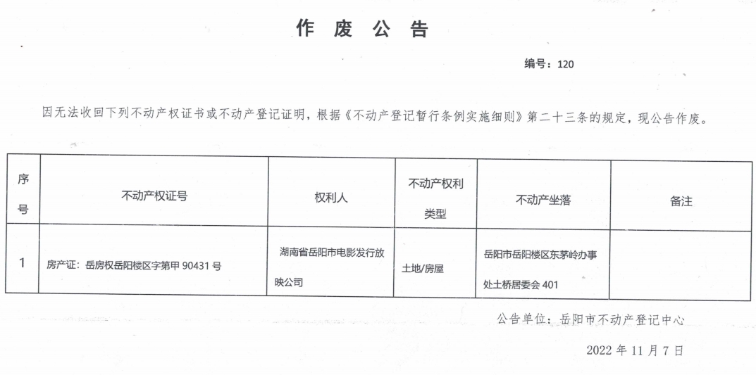 作废公告 编号:120(湖南省岳阳市电影发行放映公司)