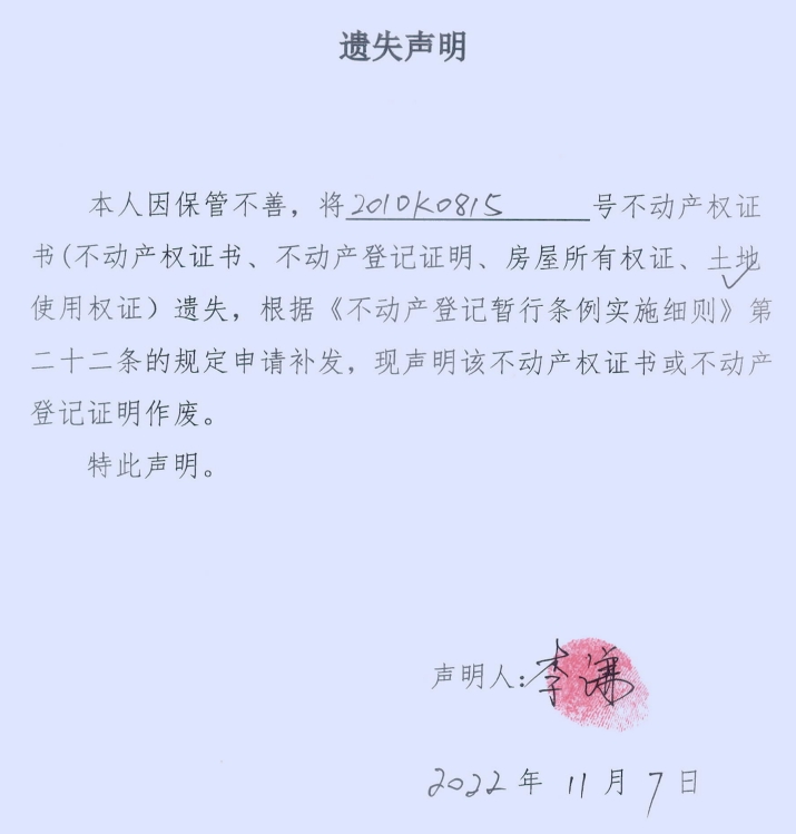 遗失声明(李谦)