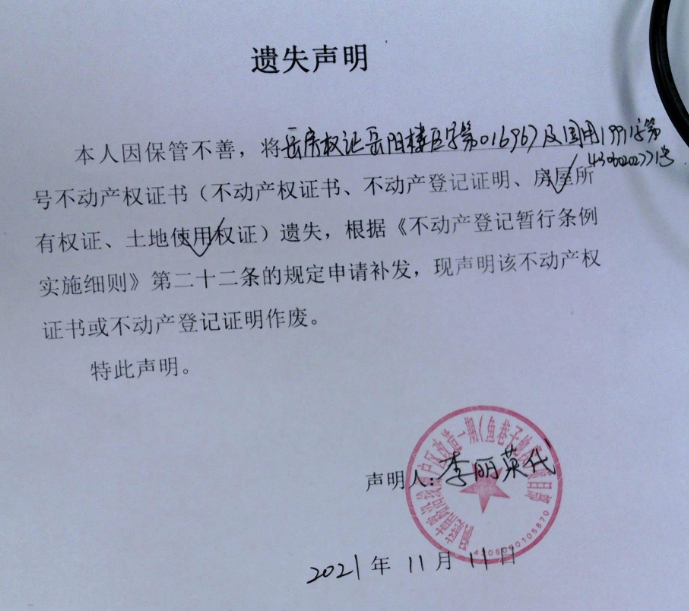 遗失声明(洞庭南路沿线棚户区改造一期(鱼巷子地段)项目部(李丽荣代)