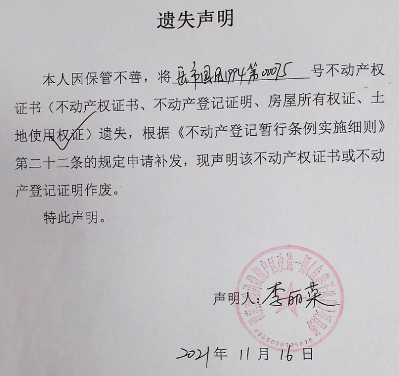 遗失声明(洞庭南路沿线棚户区改造一期(鱼巷子地段)项目部(李丽荣代)