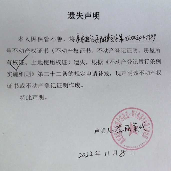 遗失声明(洞庭南路沿线棚户区改造一期(鱼巷子地段 )项目部(李丽荣代)