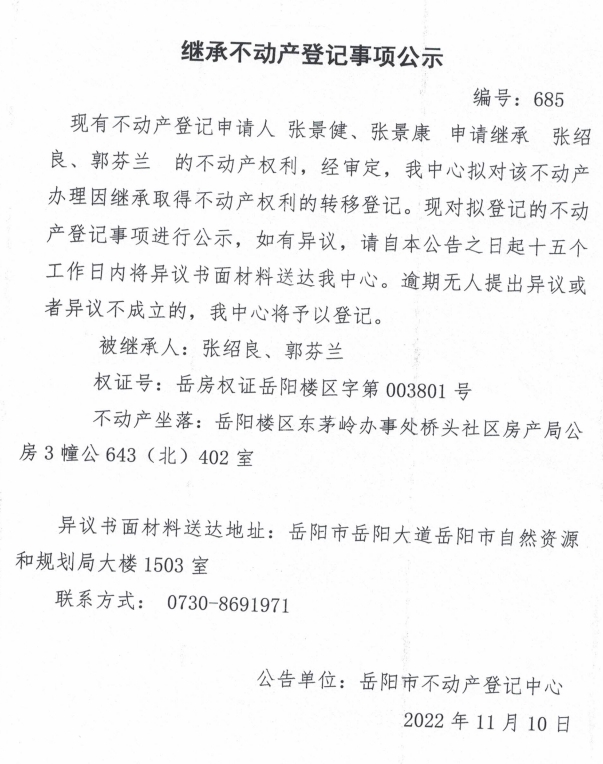 继承不动产登记公示 编号:张景建、张景康(685)