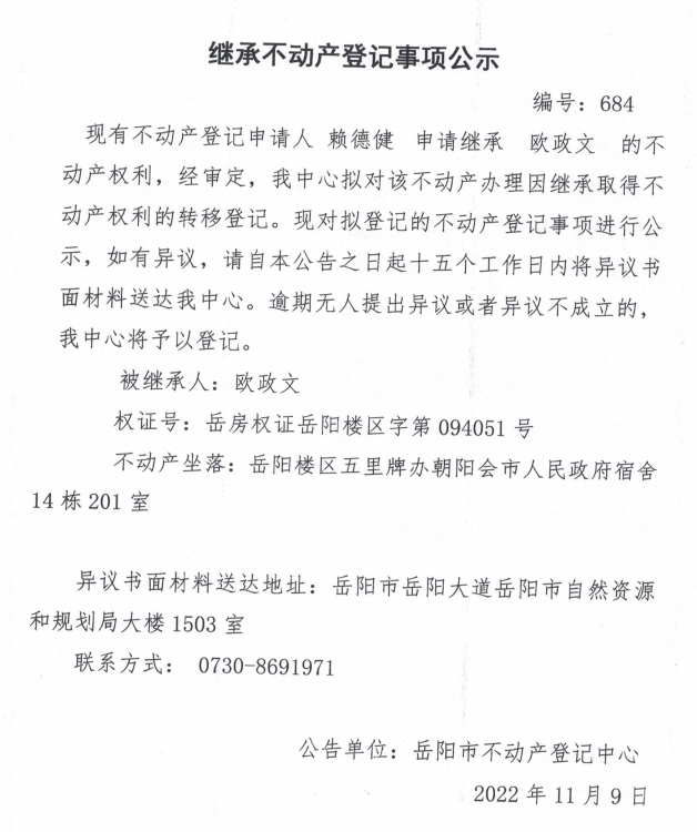 继承不动产登记公示 编号:赖德健(684)