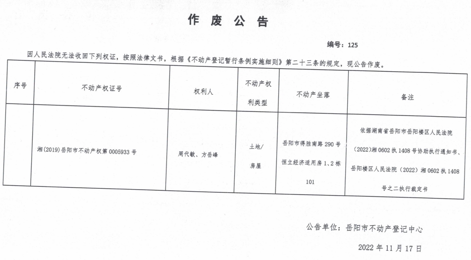 作废公告:125(周代敏、方岳峰)