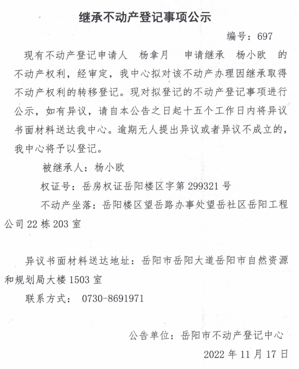 继承不动产登记公示 编号:杨拿月(697)