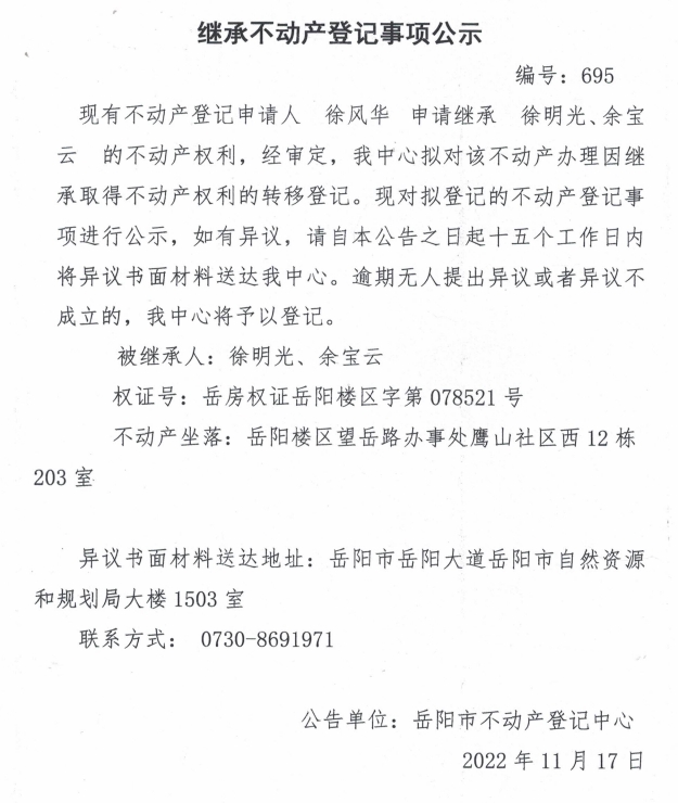 继承不动产登记公示 编号:徐风华(695)