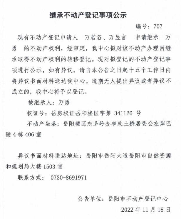 继承不动产登记公示 编号:万若谷、万昱言(707)