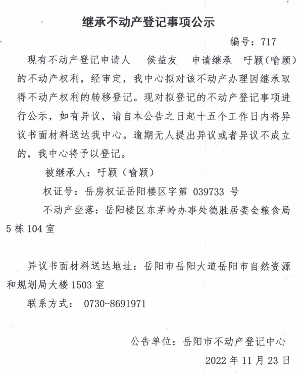 继承不动产登记公示 编号:侯益友(717)