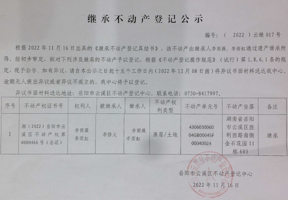 继承不动产登记公示 编号:(2022)云继017号