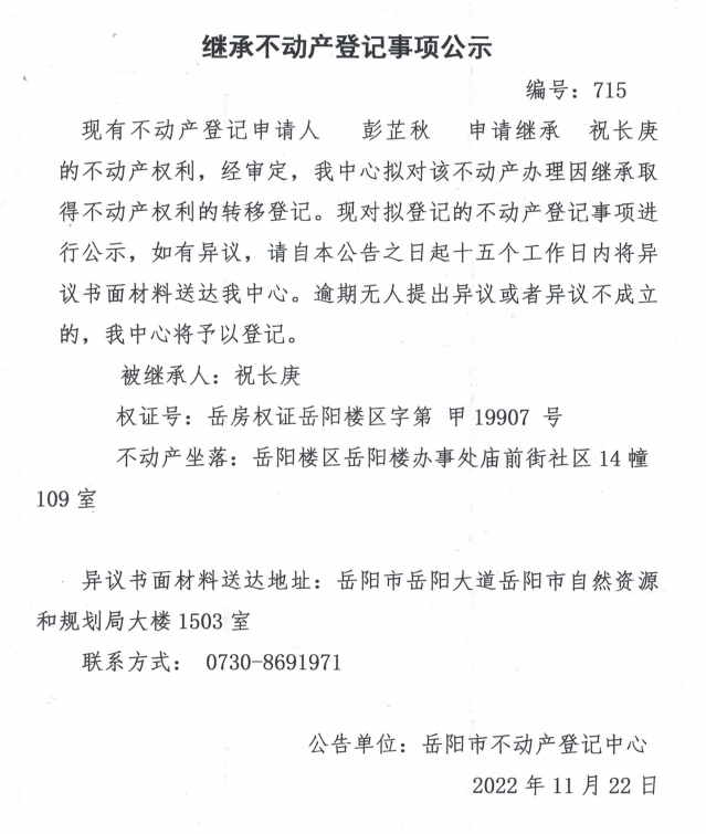 继承不动产登记公示 编号:彭芷秋(715)