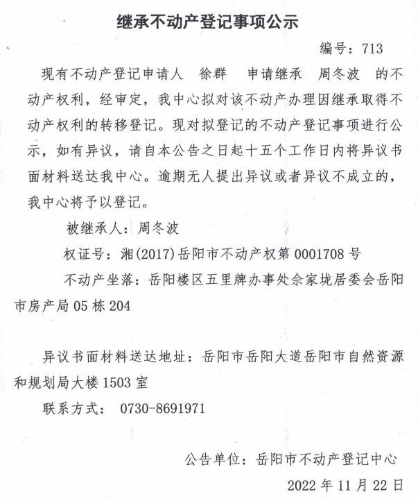继承不动产登记公示 编号:徐群(713)