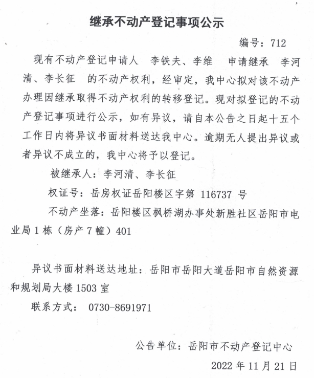 继承不动产登记公示 编号:李铁夫、李维(712)
