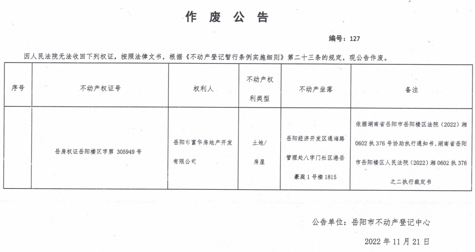 作废公告 编号:127(岳阳市富华房地产开发有限公司)