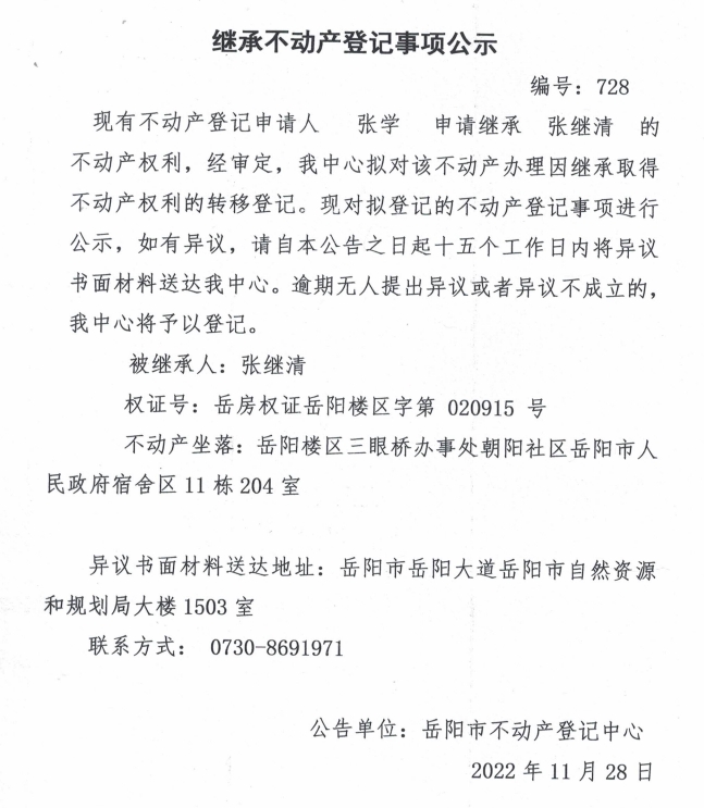 继承不动产登记公示 编号:张学(728)