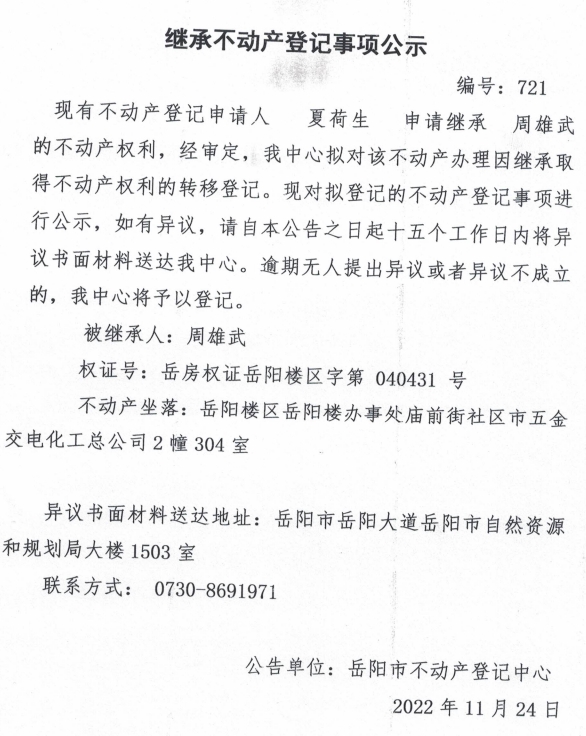 继承不动产登记公示 编号:夏荷生(721)
