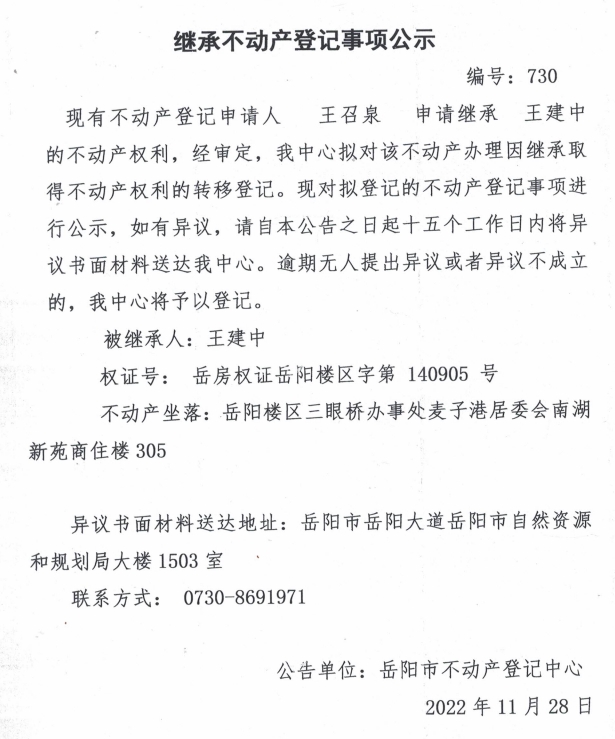 继承不动产登记公示 编号:王召泉(730)