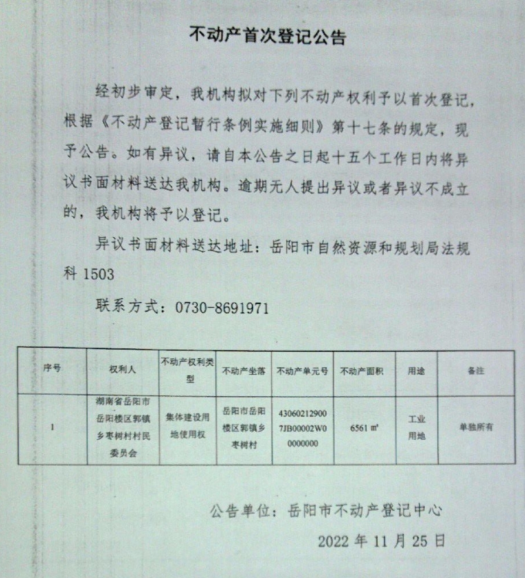 不动产首次登记公告(湖南省岳阳市岳阳楼区郭镇乡枣树村村民委员会)
