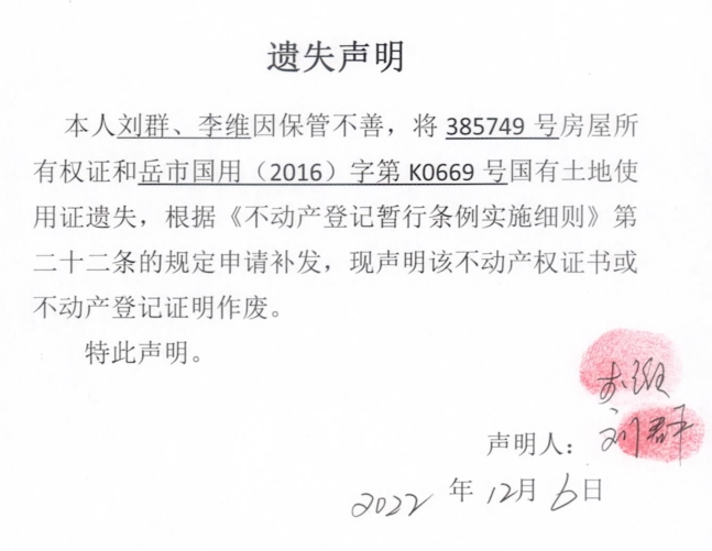 遗失声明(李维、刘群)