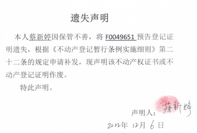 遗失声明(蔡新婷)