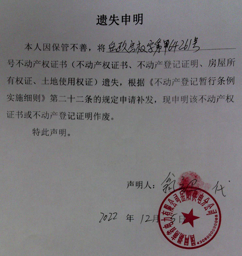 遗失声明(国网湖南省电力有限公司岳阳供电分公司,翁立卫代)