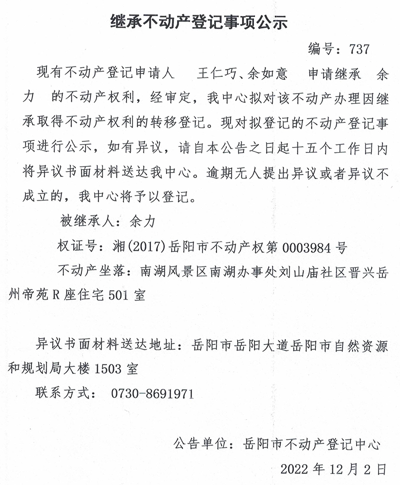 继承不动产登记公示 编号_ 王仁巧、余如意(737)