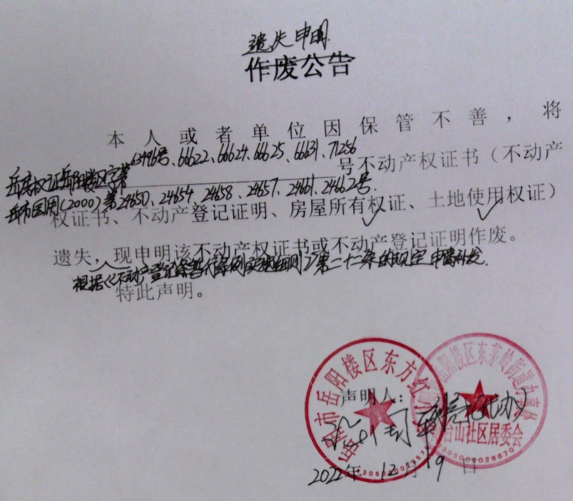 遗失声明(炮台山社区居民委员会东方红小学项目部)