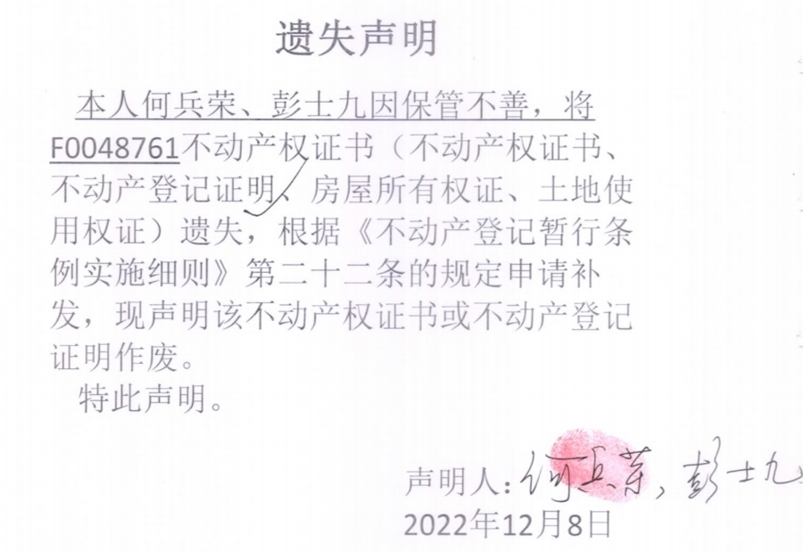 遗失声明(何兵荣、彭士九)