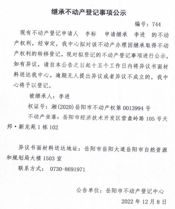 继承不动产登记公示 编号:李标(744)
