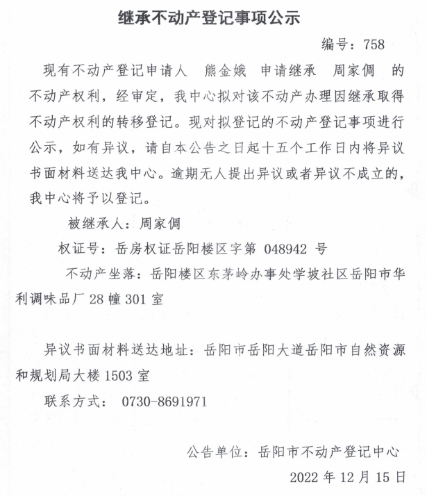 继承不动产登记公示 编号:熊金娥(758)