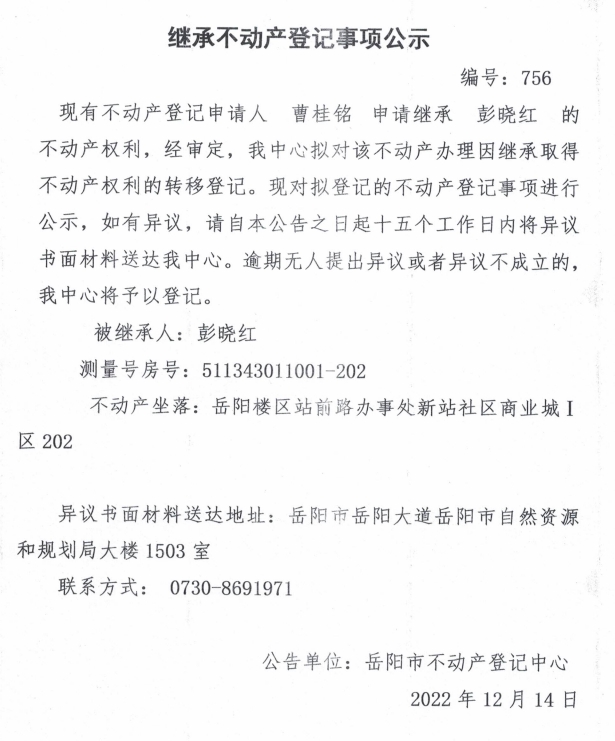 继承不动产登记公示 编号:曹桂铭(756)