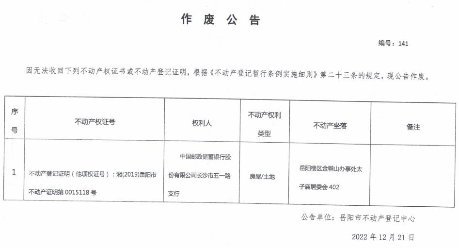 作废公告 编号:141(中国邮政储蓄银行股份有限公司长沙市五一路支行)