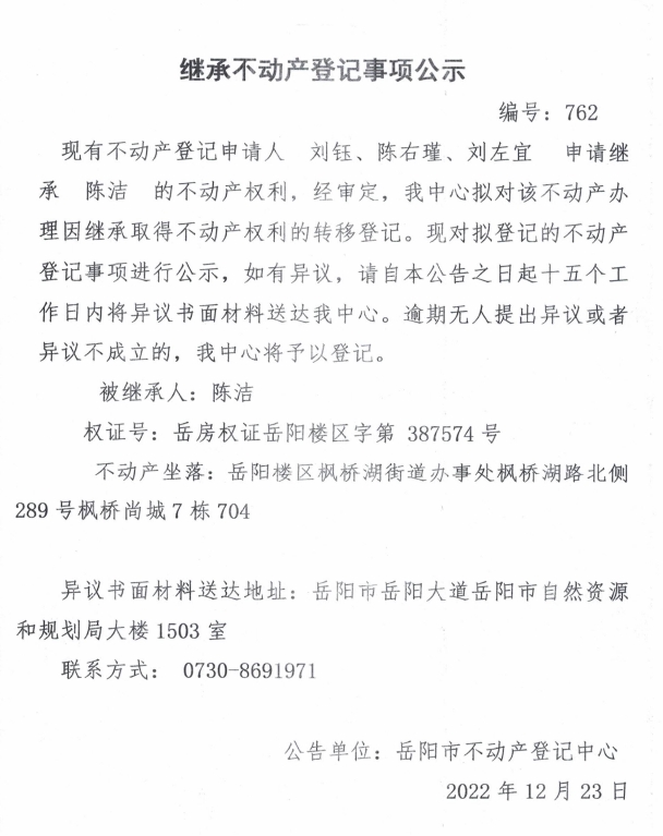 继承不动产登记公示 编号:刘钰、陈右瑾、刘左宜(762)