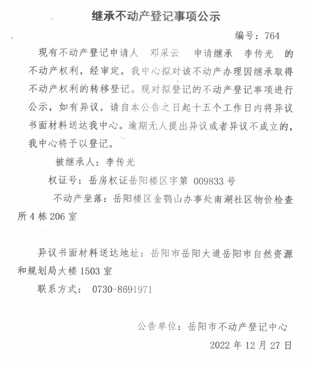 继承不动产登记公示 编号:邓采云(764)