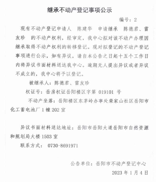 继承不动产登记公示 编号:陈建华(2)