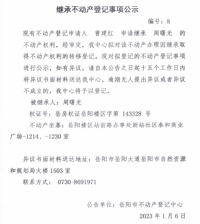 继承不动产登记公示 编号:曹建红(8)