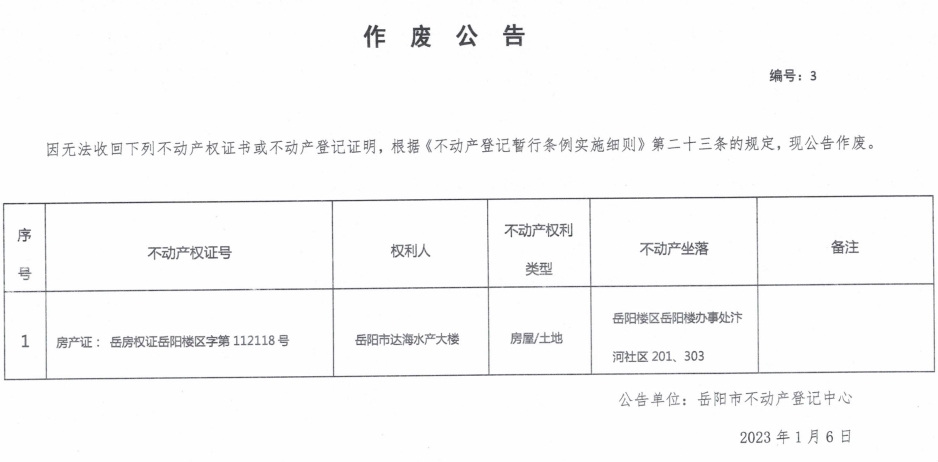 作废公告 编号:3(岳阳市达海水产大楼)
