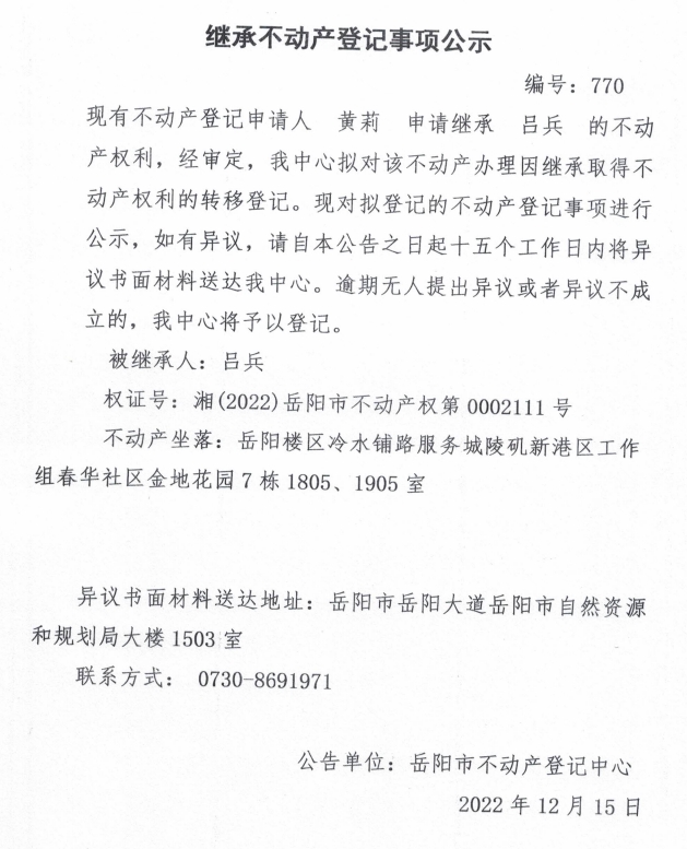 继承不动产登记公示 编号:黄莉(770)