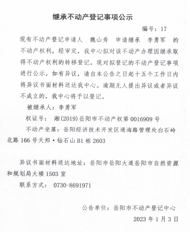 继承不动产登记公示 编号:魏山秀(17)