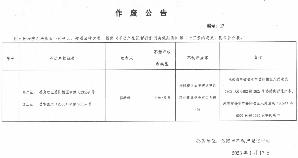 作废公告 编号:17(郭希标)