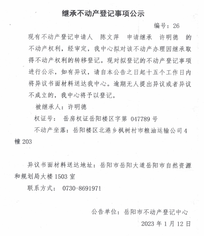继承不动产登记公示 编号:陈文萍(26)