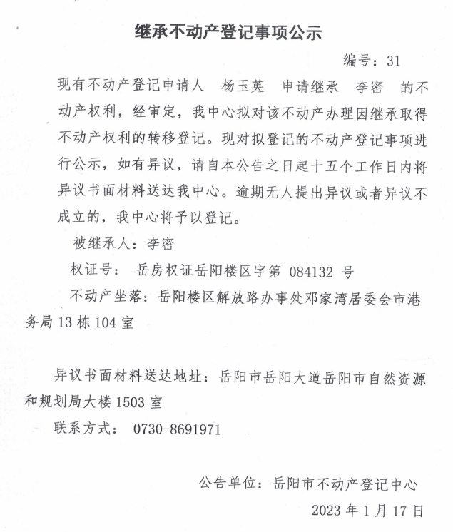 继承不动产登记公示 编号:杨玉英(31)