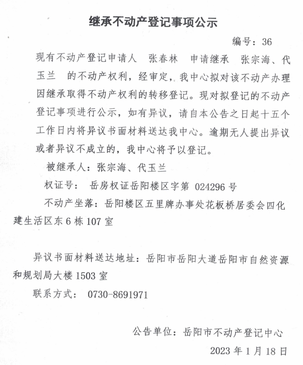 继承不动产登记公示 编号:张春林(36)