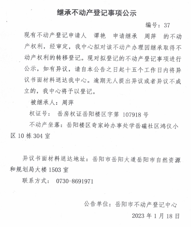 继承不动产登记公示 编号:谭艳(37)