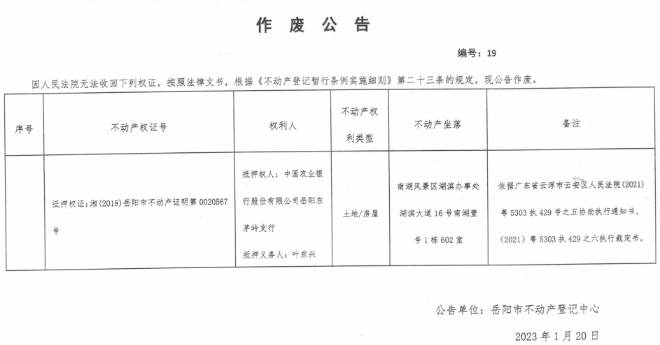 作废公告 编号:19(中国农业银行股份有限公司岳阳东茅岭支行)