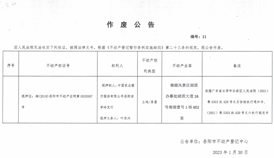 作废公告 编号:21(中国农业银行股份有限公司岳阳东茅岭支行)