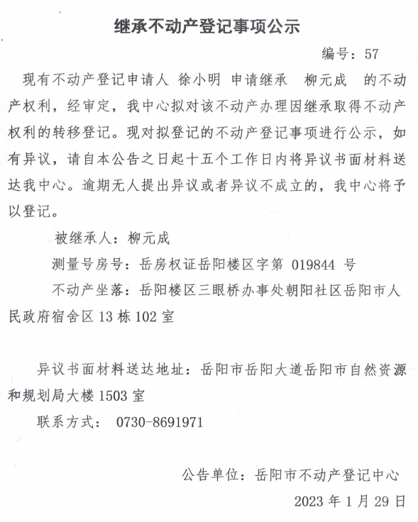 继承不动产登记公示 编号:徐小明(57)