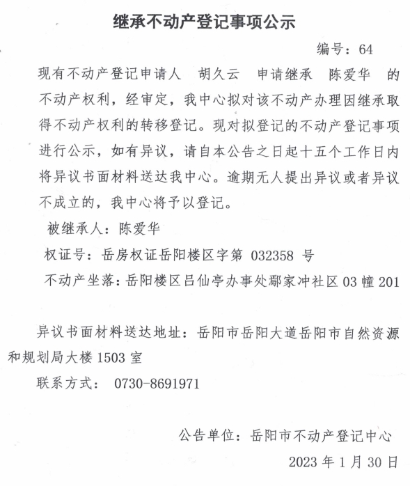 继承不动产登记公示 编号:胡久云(64)