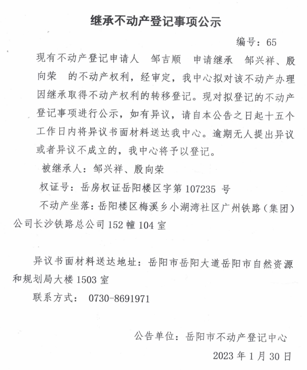 继承不动产登记公示 编号:邹吉顺(65)