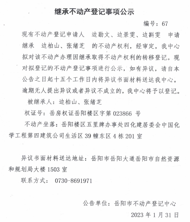 继承不动产登记公示 编号:边勘文、边景雯、边斟雯(67)