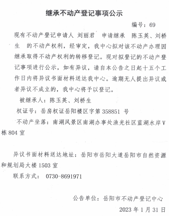 继承不动产登记公示 编号:刘丽君(69)
